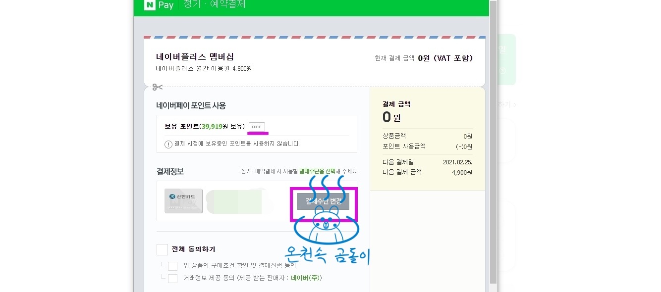 매달 나가는 네이버플러스 멤버쉽 요금을 굳이 내 계좌에서 결제할 필요가 있을까요??? 내 소비습관을 따져봤을때 네이버플러스 멤버십을 이용하면서 매달 쌓이는 포인트가 4900원이 넘는다면 멤버십 사용 요금을 포인트로 결제하는게 더 낫지 않을까요?? 어차피 네이버페이 포인트도 실제 돈처럼 쓸 수 있잖아요!!